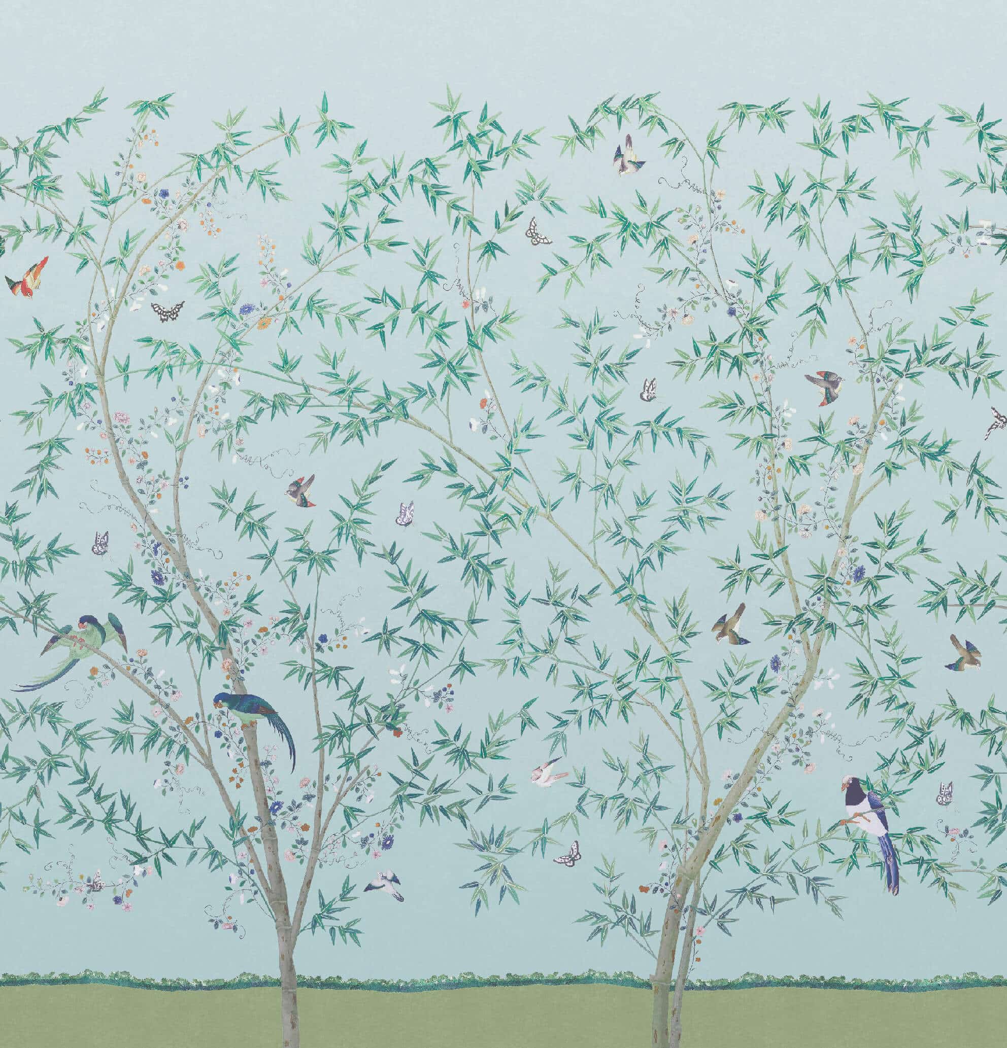 Belton Scenic Pavilion Little Greene Wallpaper The original, much-admired version of this wallpaper can be seen in the Chinese bedroom at Belton House in Lincolnshire. Whilst the paper – a garden party scene, depicted in a combination of printed and hand-painted elements – dates from 1785, it is known to have been hung over 50 years later, in 1840. The original layout, including human figures, exotic birds, awkward scale, quirky perspective and odd details, has been simplified to give space to the spreading bamboo and charming interaction of birds, butterflies and flowers. Available in three colourways, the horizontal pattern repeats over two standard rolls, making the final panel just over three metres in width.