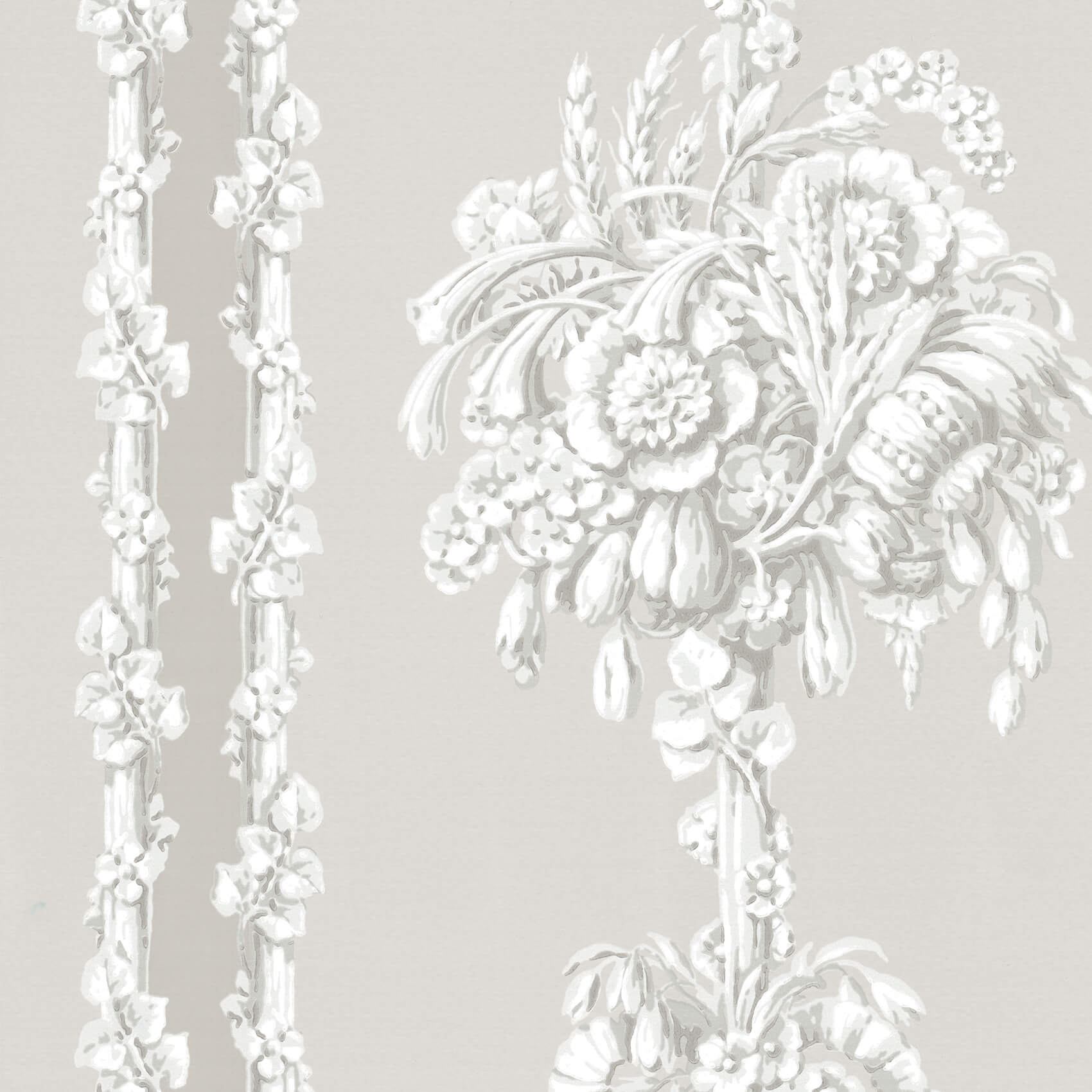 Chelsea Bridge Hush Little Greene Wallpaper Stylistically this pattern is unmistakably French, but the archive piece, which has prescribed very little by way of redesign, came from a prestigious address near the Thames. The decorative stripe either side of the floral column is retained but reduced in weight to give a more balanced feel to the pattern when hung in repeat.