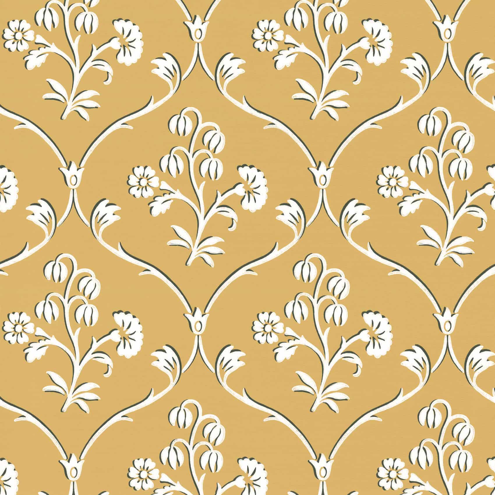 Cranford Wheat Little Greene Wallpaper This mid-18th century paper, found in Cranford, Middlesex, has a yellow floral ogee motif printed on to thick, hand-made rag paper. It is unusual because yellow, although a popular colour, was expensive and prone to fading. It was manufactured using ‘slip-printing’, a technique to make the paper appear more expensive than it really was due to its ‘shadow’ effect, which was achieved economically by using the same block to print two different colours.