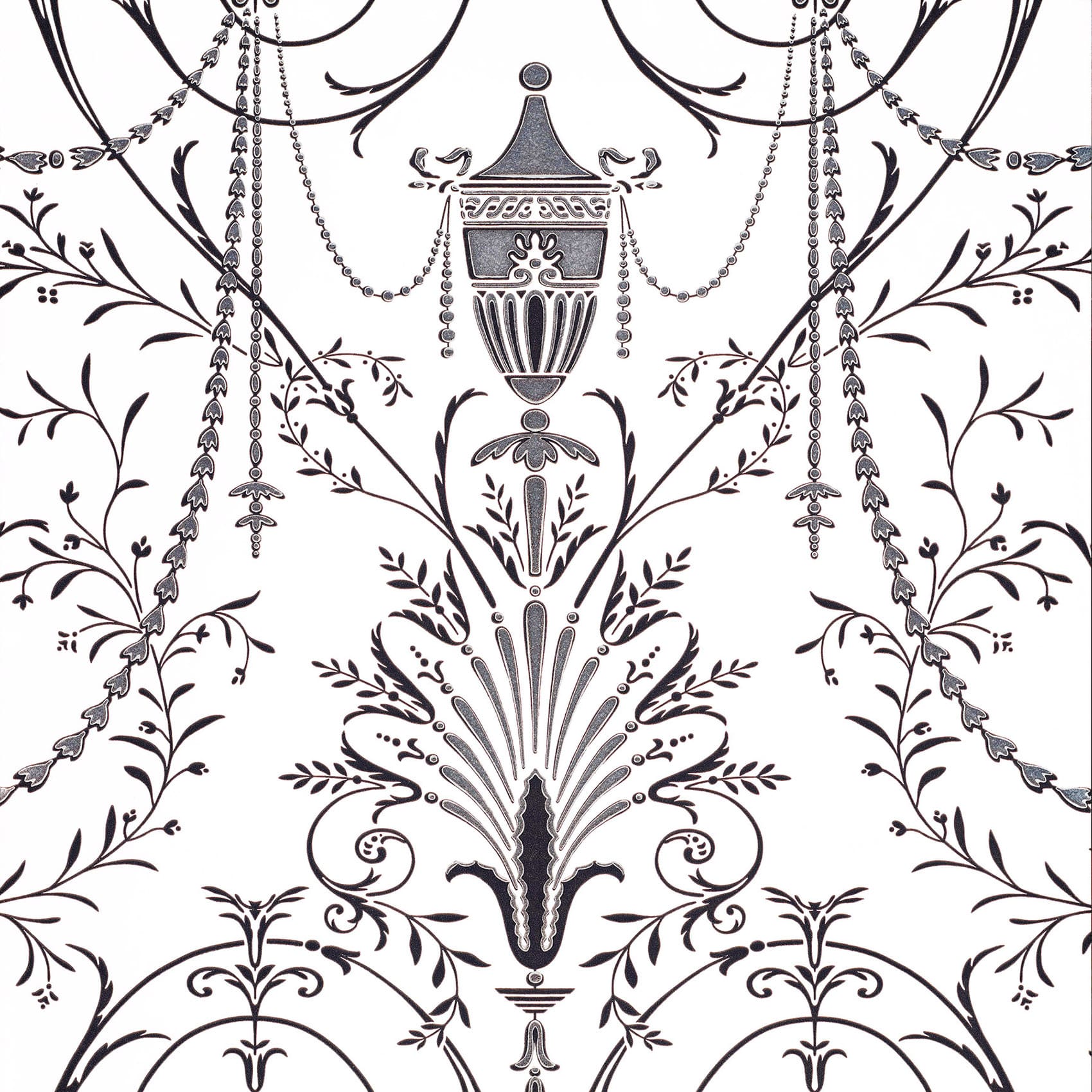 Marlborough Glace Little Greene Wallpaper A large-scale pattern, reminiscent of an early 20th century interpretation of one of Robert Adam’s designs. This paper was discovered just after the death of Queen Mary, who lived in Marlborough House until 1953, after which the house became the headquarters of the Commonwealth Secretariat.
