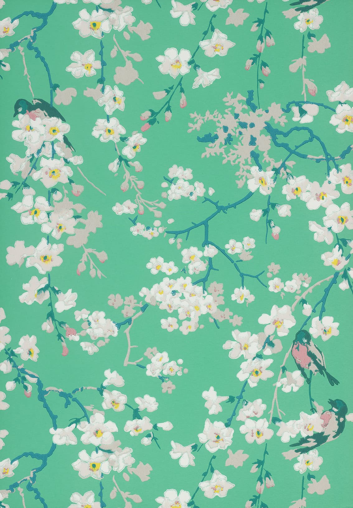 Massingberd Blossom Verditer Little Greene Wallpaper ‘Massingberd Blossom’ (Gunby Hall) c.1905 The wallpaper from which this design is drawn, is most likely of British Edwardian origin, but stylistically is very representative of the era’s passion for oriental design, which – in a time of pre-modern artistic sensibility – was seen to retain a close connection to nature, simplicity and harmony. The trailing blossom and repeating birds are elements commonly found in early, hand-painted chinoiserie, and the use of traditional surface printing retains a tactile quality that subtly offers more to the discerning eye than a conventionally mass-produced paper. It once adorned the walls of the Grey Room at Gunby Hall in Lincolnshire, a large country house built some 200 years earlier for the Member of Parliament William Massingberd, that was bequeathed to the National Trust in 1944.