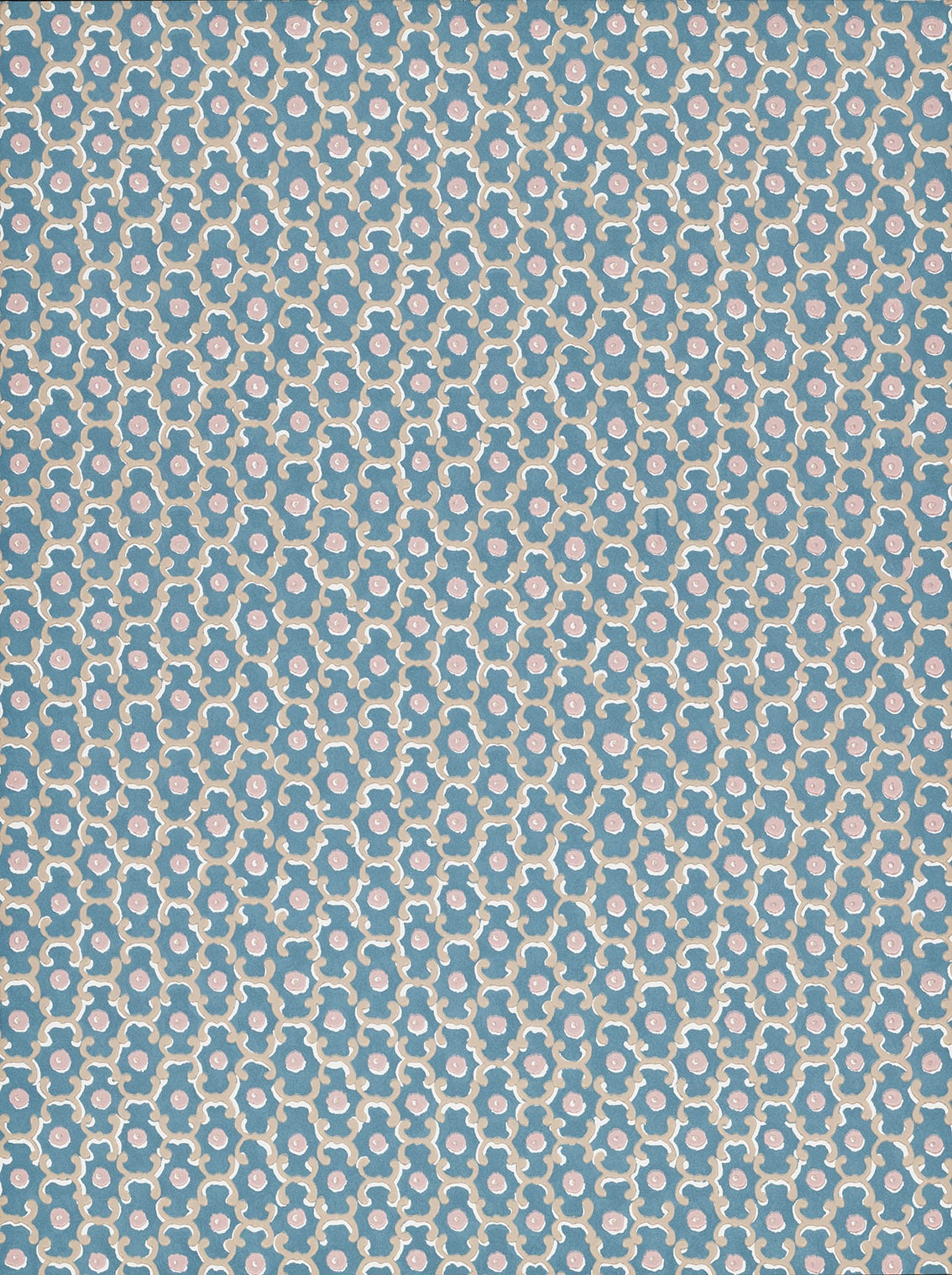 Moy Blue Little Greene Wallpaper ‘Moy’ (The Argory) c.1875 Little is known about this small-scale print found at The Argory, just outside Moy in Northern Ireland. The surviving fragment is estimated to be late-19th century in origin, and was printed using diluted watercolours rather than a more conventional, substantial ink or even opaque paint. This slightly broken effect, combined with the shadowing seen within the loose geometric pattern, gives a life to the design that would be difficult to achieve straight from the drawing board.