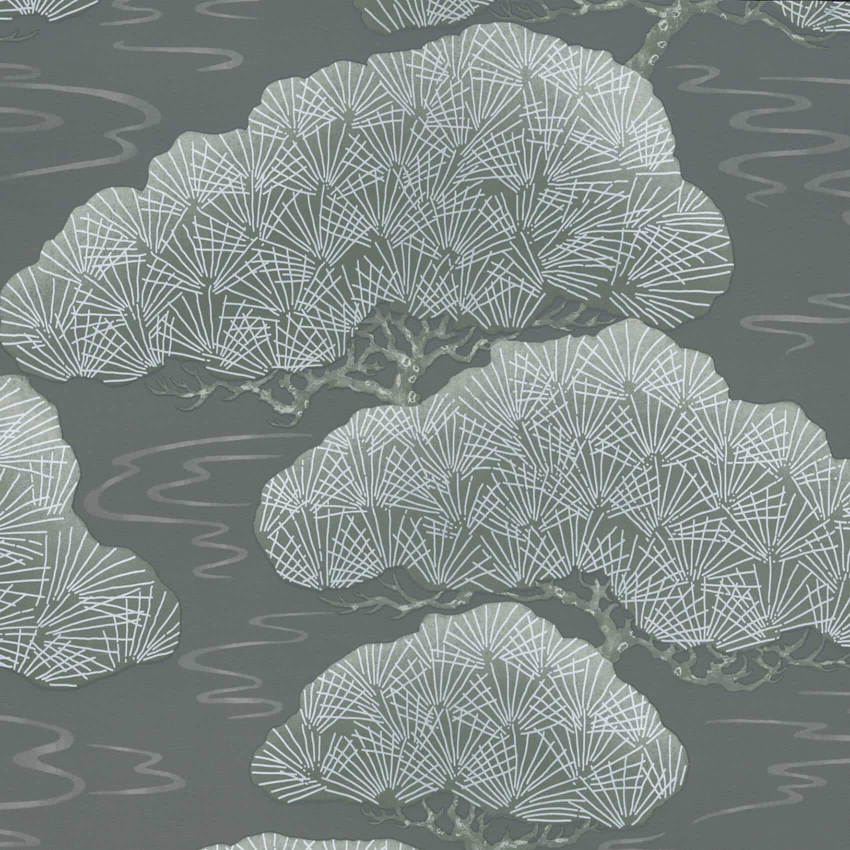 Pines Silver Pine Little Greene Wallpaper Drawn from an early 19th century silk kimono, an abstract depiction of Pine Trees emerging out of the clouds.