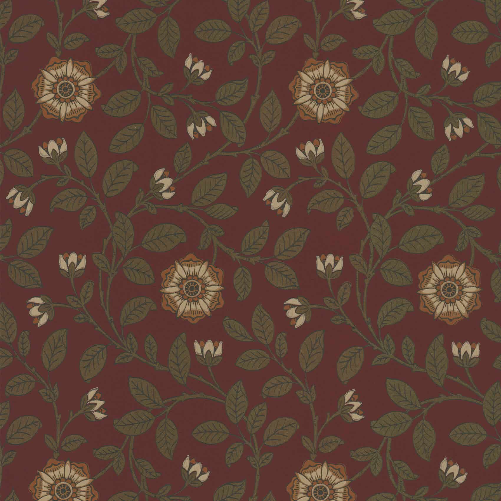 Richmond Green Revival Red Little Greene Wallpaper Unbefitting to the quality of this 19th century paper, the surviving sample was retrieved, not from the walls of a smart Richmond townhouse, but from a skip outside it, during a 1989 refurbishment. A delicate tudor rose, the execution is typical of many designs produced in the style of William Morris in the late 19th century. Little Greene has printed it in two authentic Arts & Crafts colourways, three classic colourways and a modern metallic.
