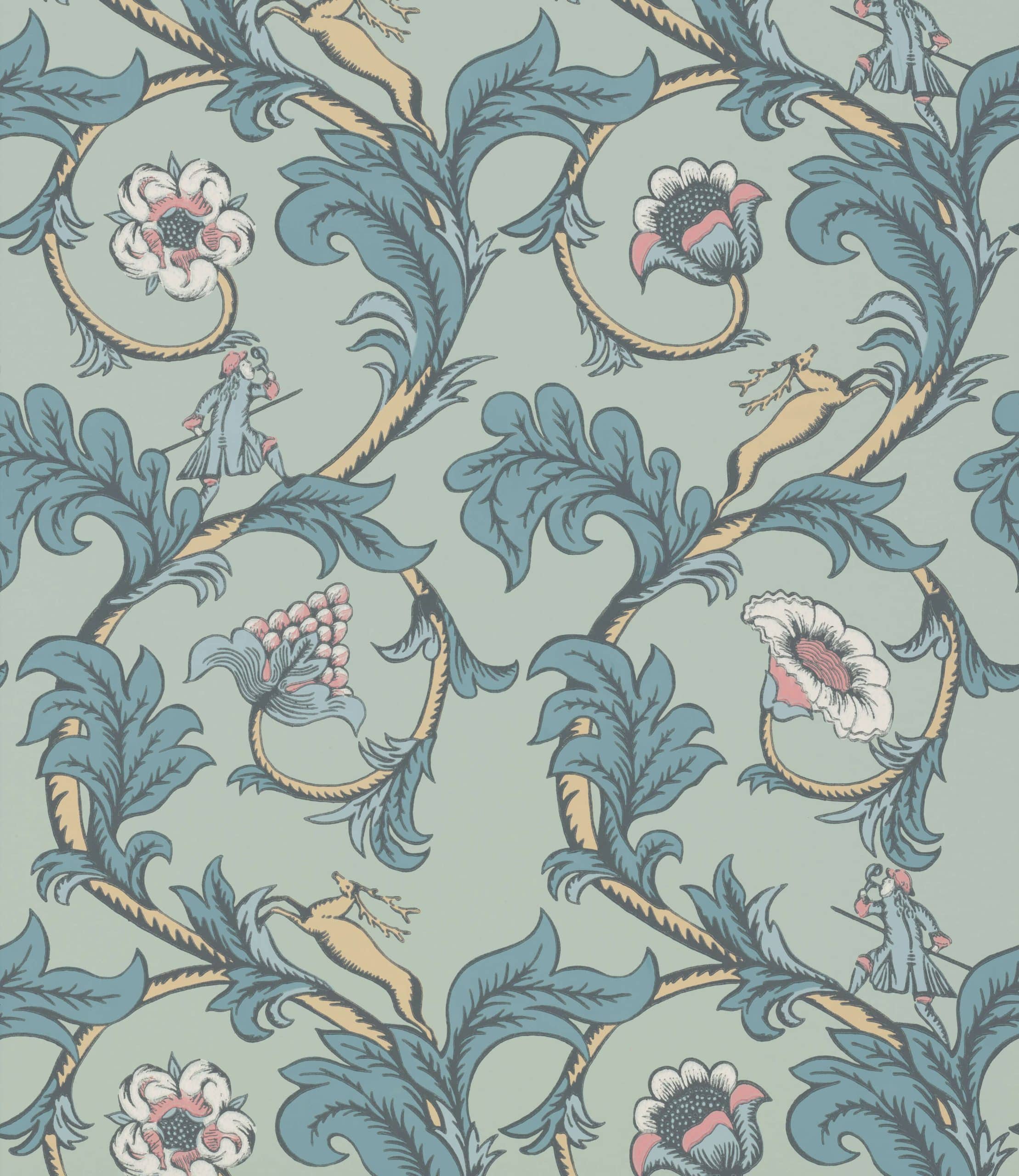Stag Trail Arsenic This classic Georgian design can be seen at Greyfriars, a medieval timber house in Worcester. The property’s 20th Century owner, Elsie Moore, acquired some unused rolls from a rectory attic in nearby Pershore, and displayed sections of them as framed panels in her bright yellow dining room. Suspecting that the turquoise pigment in the ground could have been arsenic, she covered the panels in plain brown paper to prevent the unwitting poisoning of either herself or her guests. The holes made by the pins she used can still be seen today, but the paper is, thankfully, (safely) back on show. The scale of the original pattern has been reduced for usability, whilst the four colourways include a nod to the original, a traditional interpretation and more contemporary options.