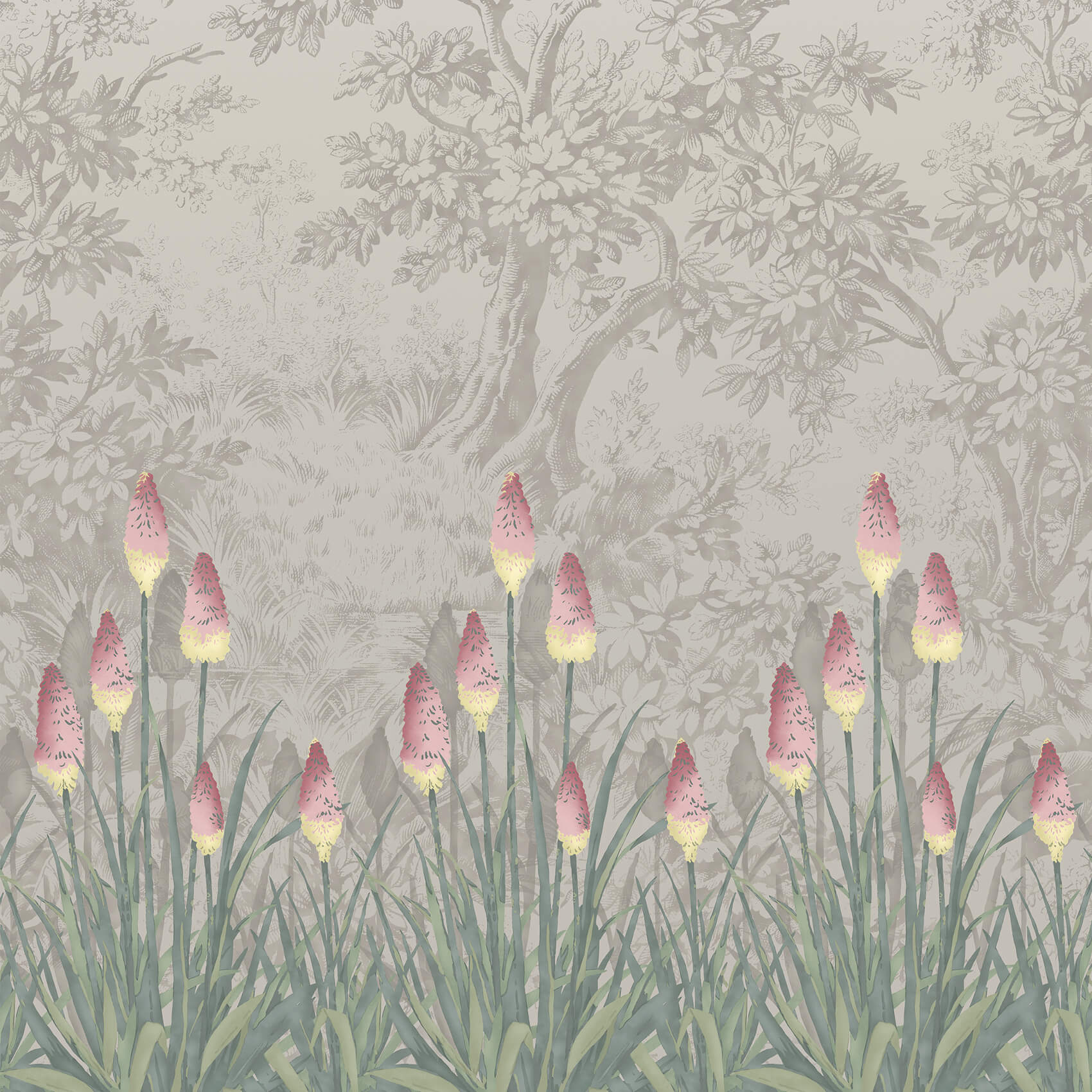 Upper Brook Street Matin Little Greene Wallpaper The design features brightly coloured kniphofia flowers, commonly known as torch lilies or red hot pokers (African in origin but named after German horticulturalist Johan Hieronymous Kniphof). They were recorded as having been hand-painted and stuck over a pre-hung wall covering in a late-18th century Upper Brook Street house as a bespoke decoration. To replicate a natural scene behind the pokers Little Greene has adapted a motif from its Stag Toile paper.