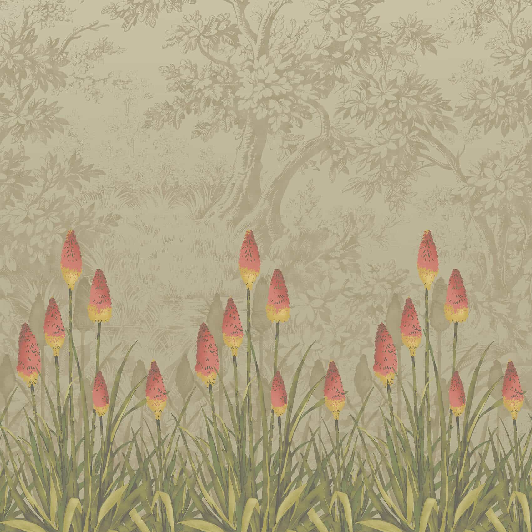 Upper Brook Street Midi Little Greene Wallpaper The design features brightly coloured kniphofia flowers, commonly known as torch lilies or red hot pokers (African in origin but named after German horticulturalist Johan Hieronymous Kniphof). They were recorded as having been hand-painted and stuck over a pre-hung wall covering in a late-18th century Upper Brook Street house as a bespoke decoration. To replicate a natural scene behind the pokers Little Greene has adapted a motif from its Stag Toile paper.