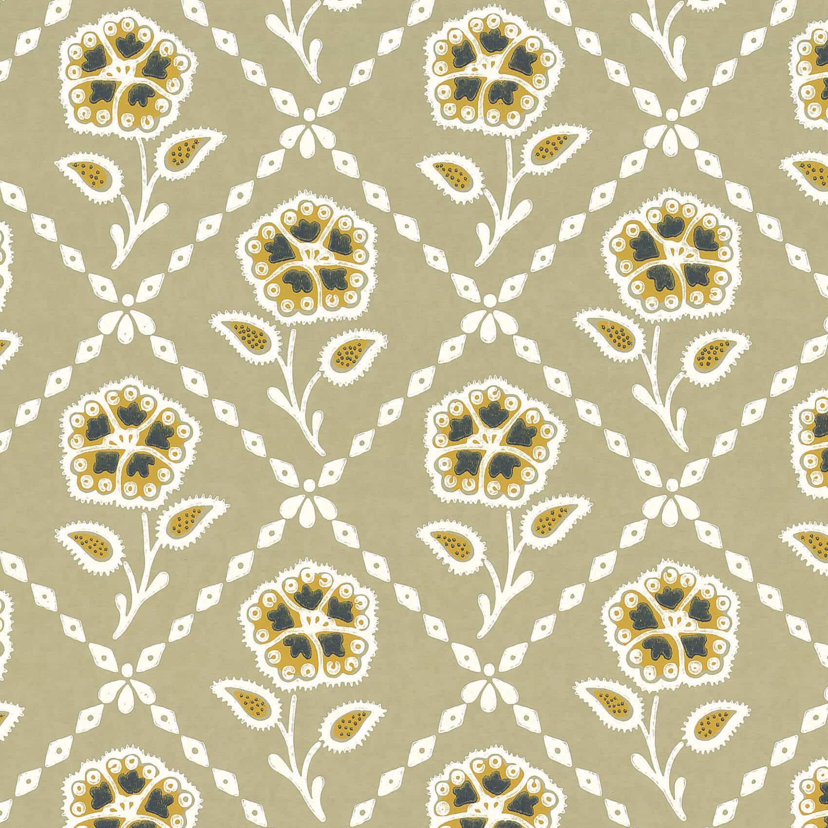 Whitehall Moutarde Little Greene Wallpaper Found in a medieval property that was at one time home to a Surrey school, there is a clear French influence in this paper. The floral trellis pattern is undoubtedly inspired by textile design; printed linen and fustian fabrics in this style became very popular during the mid 18th Century.