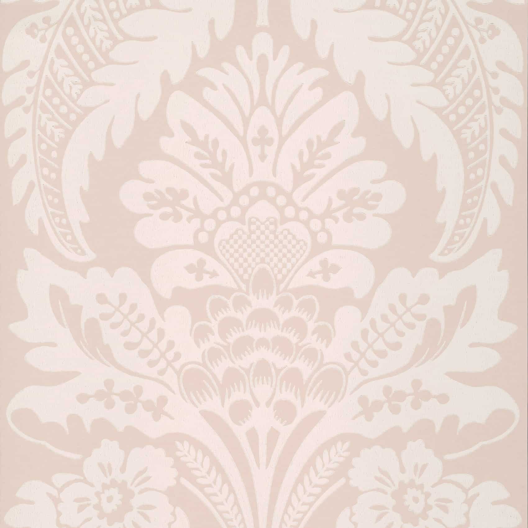 Wilton Gypsum Little Greene Wallpaper A classic damask design that is very typical of the popular large-scale pomegranate patterns of the mid-18th century, this would originally have been a flock wallpaper and hung in a grand English home. Flock papers were an English speciality and were really just imitations of expensive textiles, but nonetheless, they were expensive to produce and a bold statement of luxury and social status.